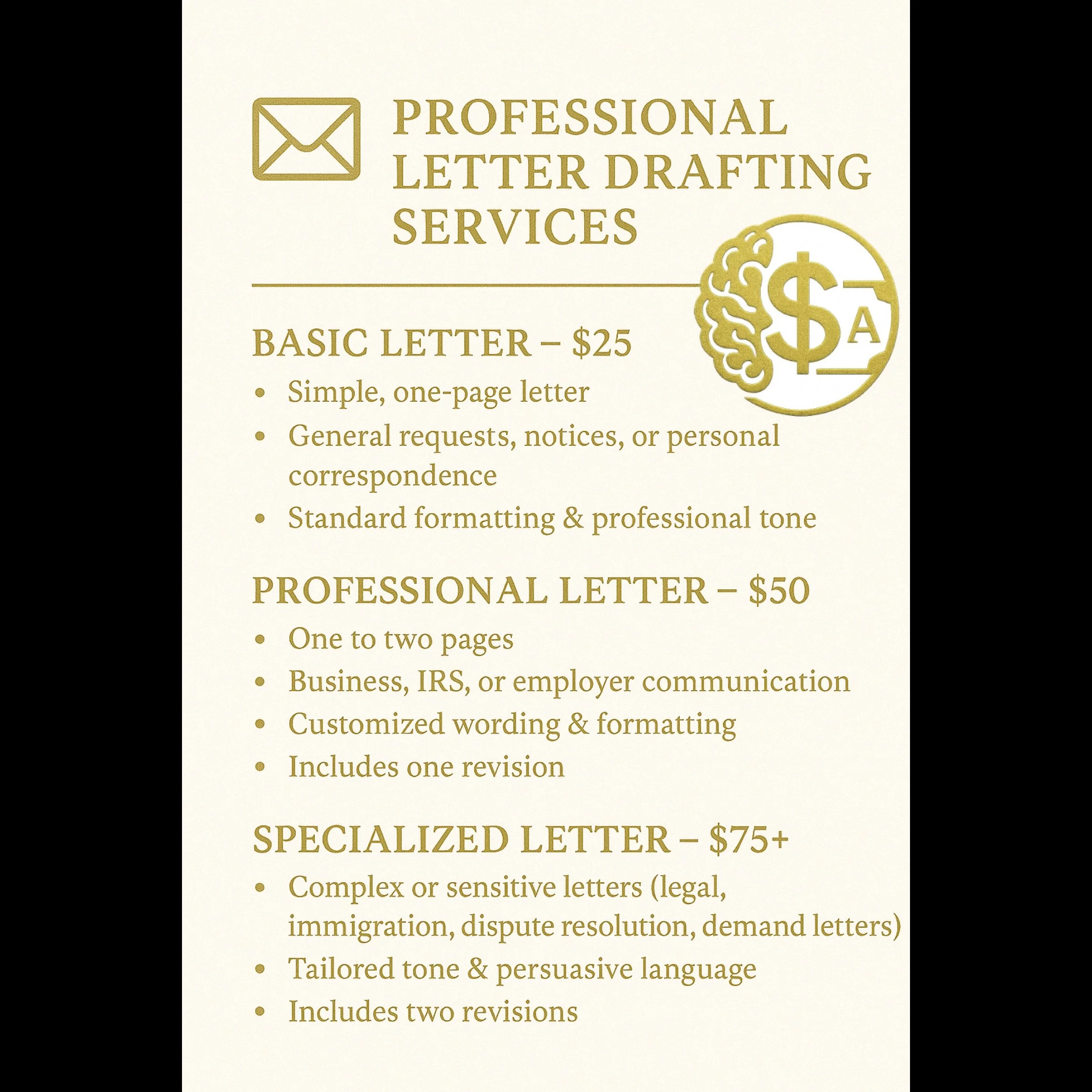 Categorías: $A Tax Agency 77 THE GOLDEN STANDARD ~ $A Academy Tax Representation & IRS Services PROFESSIONAL TAX SERVICES Business and Entrepreneurship W-7 (ITIN) SERVICES IMMIGRATION LIMITED LETTERS/TRANSLATIONS NOTARY SERVICES AFFILIATE TOOLS Vista rápida Professional Letter Drafting Services- SPECIALIZED USD 75.00 Vista rápida Profesional Letter Drafting Service - PROFESSIONAL USD 50.00 Vista rápida Professional Letter Drafting Services - BASIC USD 25.00